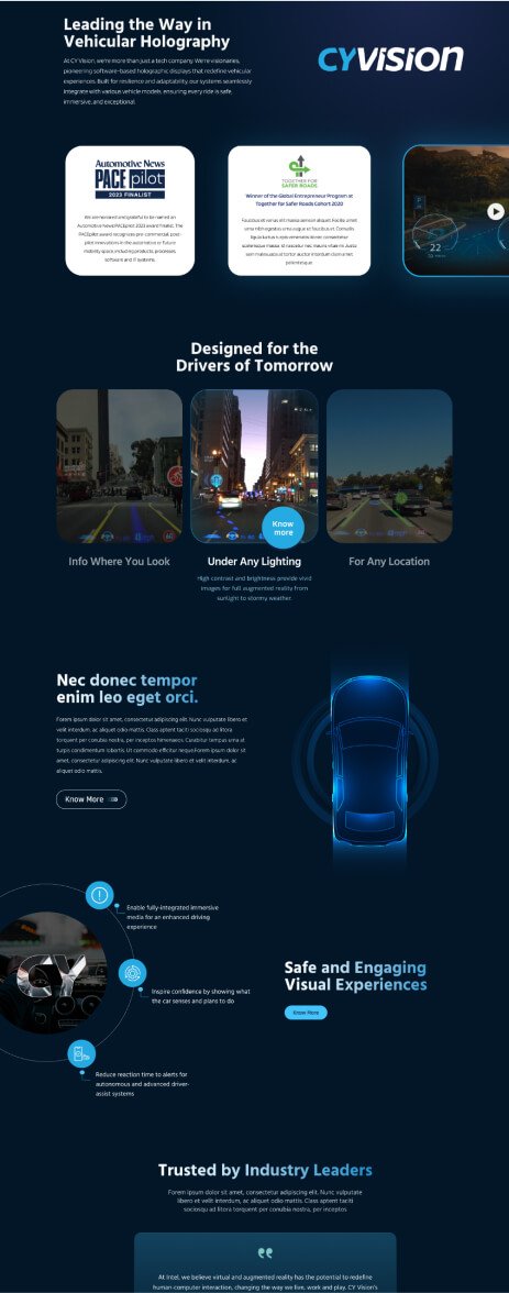 Supporting Cyvision to capitalize on the $5.8B AR automotive market with an interactive website identity, seamless 3D HUD visualization, and engaging UX.